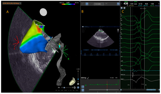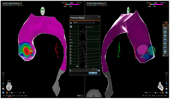 Anatomical mapping data were collected using a 3D mapping system (CARTO 3, Bio-sense Webster) and a contact force mapping-ablation catheter (ThermoCool SmartTouch, Biosense Webster Inc., Minneapolis, MA, USA). The activation mapping was performed in each case: the PVC origin site was defined as the earliest site of local ventricular activation preceding the onset of the QRS wave by at least 30 ms on the surface ECG and with a QS signal in unipolar mapping (Figure 1).