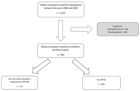 Given that infection with oncogenic viruses contributes to an increased risk of DPTM in transplant recipients, preventive policies, such as human papillomavirus (HPV) vaccination programs, have been introduced in some countries [8]. Routine cancer screening programs post-transplant have also been suggested to enable the earlier detection of DPTM [9]. Whilst these measures are now increasingly established within the clinical setting, a holistic understanding of the risk factors, time to diagnosis, and effects of DPTM on overall clinical outcomes remain incomplete. In order to provide further answers to these knowledge gaps, we conducted an observational study with more than 20 years of patient follow-up. Therefore, this study aimed to determine the predictors of time to DPTM, excluding non-melanoma skin cancers, and to evaluate the impact of DPTM on graft and patient survival post-transplantation.
