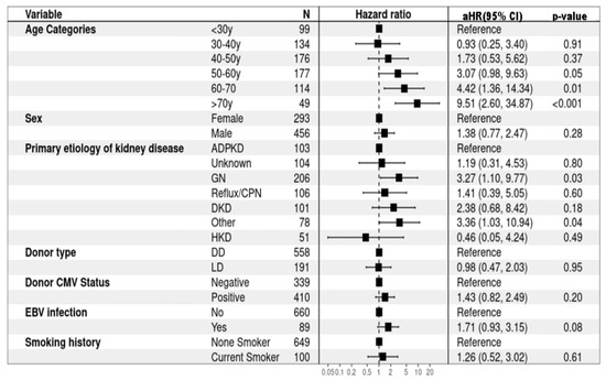 In the univariate Cox regression analysis, several factors were identified as significant risk factors for the development of DPTM, including older age at the time of kidney transplant (HR 1.59, 95%CI: 1.34–1.88, p < 0.001), higher median C-reactive protein (CRP) levels (HR 1.02, 95%CI: 1.01–1.02, p < 0.001), and EBV infection (HR 2.09, 95%CI: 1.28–3.41, p = 0.003) (Supplementary Table S3). In the multivariate model, age >60 years at the time of kidney transplantation emerged as a significant risk factor for the development of DPTM. Specifically, individuals aged 60–70 years demonstrated an aHR of 4.42 (95%CI: 1.36–14.34, p < 0.001), while those aged over 70 years exhibited a substantially higher risk, with an aHR of 9.51 (95%CI: 2.60–34.87, p < 0.001). Additionally, primary etiologies of kidney disease were identified as significant risk factors, with pre-existing GN (aHR 3.27, 95%CI: 1.10–9.77, p = 0.03) and primary etiologies classified in the ‘other’ category (aHR 3.36, 95%CI: 1.03–10.94, p = 0.04) showing statistically significant associations with DPTM development (Figure 2). However, caution is warranted when interpreting study findings relating to etiologies listed in the ‘other’ category of primary kidney diseases, as this comprises a heterogeneous group of pathologies (Supplementary Table S1), which potentially introduces variability and complexity into the analysis, making it difficult to draw definitive conclusions from results displayed here.