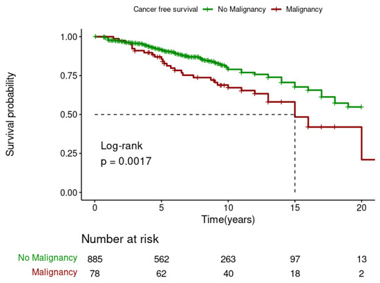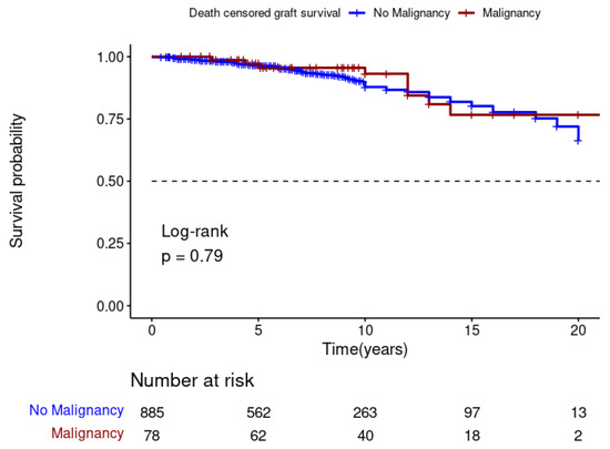 The Kaplan–Meier analysis showed that DPTM was associated with poor survival for kidney transplant recipients (Log-rank; p = 0.001) (Figure 3), but it was not associated with death-censored graft survival (Log-rank; p = 0.79) (Figure 4). The 5-, 10-, and 15-year transplant recipient survival was 92%, 79% and 67%, respectively, in the non-cancer group compared to 86%, 68%, and 48% amongst those who developed DPTM.