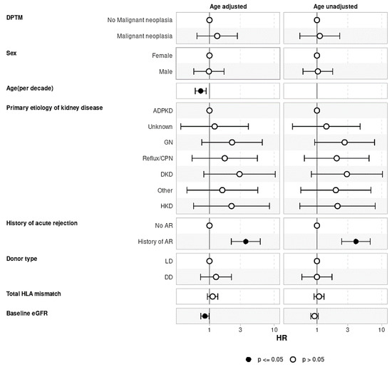 Association of de novo post-transplant malignancy on recipient survival adjusted for confounders (multivariate Cox regression analysis). The effect of DPTM on recipient survival adjusted for recipient age, gender, native kidney disease, pre-emptive transplantation, and baseline eGFR. The age-adjusted model did not show any difference in recipient survival between the DPTM group and the no DPTM group whereas the age-unadjusted model showed an increased hazard of death with DPTM. ADPKD: Autosomal dominant polycystic kidney disease; CPN: Chronic pyelonephritis; DKD: Diabetic kidney disease; DPTM: De novo post-transplant malignancy; eGFR: Estimated glomerular filtration rate; GN: Glomerulonephritis; HKD: Hereditary kidney disease.