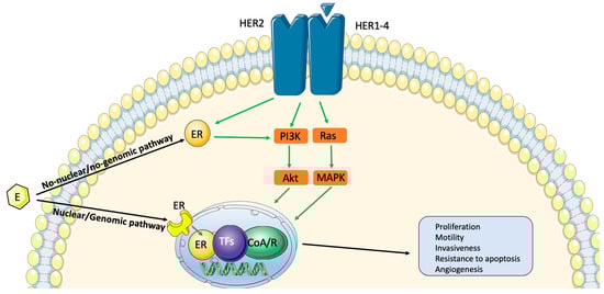- Giuliano, M.; Trivedi, M.V.; Schiff, R. Bidirectional Crosstalk between the Estrogen Receptor and Human Epidermal Growth Factor Receptor 2 Signaling Pathways in Breast Cancer: Molecular Basis and Clinical Implications. Breast Care 2013, 8, 256–262. [Google Scholar] [CrossRef] [PubMed]