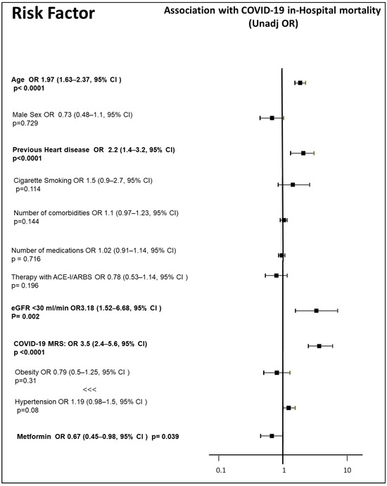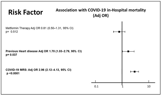 We included 524 patients in the analysis. Of those, 220 (44%) were in therapy with metformin. At baseline, 70.4% of the sample were males, 31.6% were obese, 63.5% suffered from hypertension, 13.8% had a stage 4 or 5 CKD, and 27.3% were cigarette smokers; furthermore, the enrolled patients had a median age of 74 years (64; 78 interquartile range), a median number of four comorbidities, and a median number of seven medications. The characteristics of the patients included are reported in Table 1. Patients who were in therapy with metformin were significantly younger than those who were not on metformin (72 versus 75 years of median age, p = 0.005); furthermore, metformin users had a non-significantly lower prevalence of stroke and cardiovascular disease, and a non-significantly higher prevalence of obesity and hypertension, with significantly higher use of ACE-I or ARBS (39.6 versus 26.3% of users, p = 0.014), whereas the median number of medications and comorbidities was not significantly different. The median duration of hospitalization was seven days, without a significant difference between those in therapy with or without metformin. The vast majority of patients (89.9%) needed oxygen, without any difference between those on therapy and those not on therapy with metformin. Those who needed assisted ventilation were 30% in the whole sample; there was no significant observed effect of metformin on the need for ventilation (OR 0.75 [0.5–1.11, 95% CI], p = 0.146) in a bivariate analysis. Overall, 74 patients (33.4%) died during hospitalization or within 60 days after discharge. The COVID-19 MRS was confirmed as a strong predictor of mortality (r = 0.42, p < 0.0001, with a 3.5 OR [2.4–5.6, 95% CI] for each increase in the MRS score category). A significantly greater proportion of patients on metformin therapy was considered at a low or intermediate MRS risk (34.8% and 36% of metformin users were at low or intermediate risk, respectively, versus 26.6% and 33.2% of those not on metformin), whereas a greater proportion of patients not on metformin therapy were classified as at high MRS risk (40.3% of those not on metformin, versus 29.3% of those on metformin). Age (OR 1.97 [1.62–2.37, 95% CI], p < 0.0001) and stage 4 or 5 CKD (OR 1.97 [1.62–2.37, 95% CI], p < 0.0001) were the strongest single predictors, among the components of the MRS score; furthermore, the presence of previous heart disease, which was not included in the score, was strongly associated with a higher mortality in people with diabetes (OR 2.2 [1.40–3.20, 95% CI], p < 0.0001). On the other hand, obesity (OR 0.79 [0.50–1.25, 95% CI], p = 0.31), hypertension (OR 1.19 [0.98–1.50, 95% CI], p = 0.08), male sex (OR 0.73 [0.48–1.1, 95% CI], p = 0.729), cigarette smoking (OR 1.5 [0.90–2.7, 95% CI], p = 0.114), number of comorbidities (OR 1.1 [0.97–1.23, 95% CI], p = 0.144), number of medications (OR 1.02 [0.91–1.14], 95% CI, p = 0.716), being on therapy with ACE inhibitors or Angiotensin Receptor blockers (ACE-I/ARBS, OR 0.78 [0.53–1.14], 95% CI, p = 0.196) did not show a significant correlation with mortality (Figure 1). Of the 220 patients who were on metformin therapy, 60 (27.3%) died, whereas the proportion of deceased patients who were not on metformin was 36% (99 out of 275 patients). A binomial logistic regression showed that metformin use was associated with a significant reduction in case fatality (OR 0.67 [0.45–0.98], 95% CI, p = 0.039, Figure 1). After adjusting for COVID-19 MRS, metformin use did not retain a significant association with in-hospital mortality (OR 0.795 [0.495–1.277] (OR 1.1 [0.97–1.23, 95% CI], p = 0.144), p = 0.342, Figure 2), whereas the MRS score (OR 2.96 [2.12–4.13], 95% CI, p < 0.0001) and the presence of a previous heart disease (OR 1.70 [1.03–2.79], 95% CI, p = 0.037) both retained significance with in-hospital mortality in a multivariate model (Figure 2).