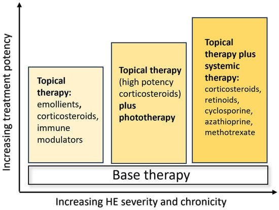 Treatment options depend on the severity of the clinical manifestations, as reported in the ESCD guidelines, and include emollients, topical corticosteroids, calcipotriol and calcineurin inhibitors in mild–moderate disease, urea and ammonium lactate for hyperkeratotic variants, and systemic therapies with retinoids as alitretinoin and acitretin, and immunosuppressive drugs such as cyclosporine, azathioprine, methotrexate, and systemic corticosteroids in severe forms. Unfortunately, classical treatments are not always effective, and there are frequent recurrences, affecting many patients for years (Figure 1) [4].