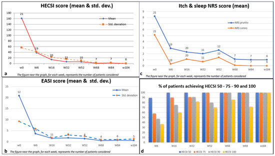 Effect of dupilumab on HECSI score, EASI score, and itch and sleep NRS over 104 weeks in patients with HE. Missing data for intermediate visits were filled in using the last observation carried forward (LOCF) technique. (a): mean HECSI scores in the overall population. (b): mean EASI scores in the overall population (c): mean itch and sleep NRS scores in the overall population (c): mean DLQI scores in the overall population (d): percentage of patients achieving HECSI 50, 75, 90, and 100 over 104 weeks. Statistical significance was observed in all time points considered (p < 0.05).