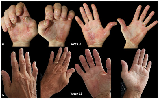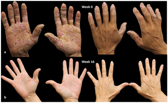 Chronic hand eczema treated with dupilumab. (a): Week 0 (HECSI 270); (b): week 16 (HECSI 0). Written consent for publication was obtained from the individual whose information is included in this study.