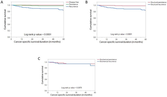 Cancer-specific survival. (A) Kaplan–Meier survival curve showing poor cancer-specific survival in patients with recurrent disease compared to those with persistent disease. (B) Kaplan–Meier survival curve showing poor cancer-specific survival in patients with structural recurrent disease compared to those with structural persistent disease. (C) Kaplan–Meier survival curve showing no significant difference in cancer-specific survival in patients with biochemical recurrent disease compared to those with biochemical persistent disease.