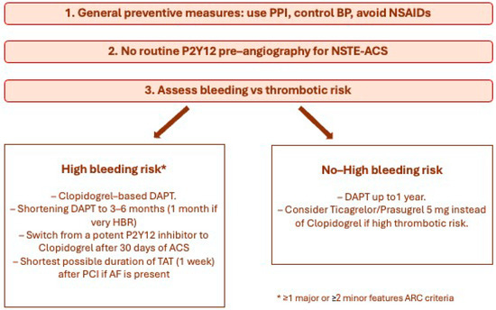ACS antithrombotic therapy approach in the elderly. PPI: proton pump inhibitor; BP: blood pressure; NSAIDs: non-steroidal anti-inflammatory drugs; DAPT: dual antiplatelet therapy; HBR: high bleeding risk, TAT: triple antithrombotic treatment, PCI: percutaneous coronary intervention, AF: atrial fibrillation, ARC: Academic Research Consortium.