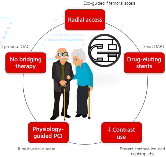 In any case, in all older patients with ACS undergoing invasive management (coronary angiogram ± PCI), certain precautions should be considered due to their higher likelihood and greater impact of developing adverse events. These recommendations are summarized in Figure 2. The use of radial access should always be prioritized over femoral access given its lower complication rate [33]. In cases where radial access is not possible, ultrasound-guided femoral puncture is recommended, utilizing a micropuncture kit and small-diameter introducers [34]. For patients previously anticoagulated (e.g., those with AF), the use of bridging therapies is discouraged, as well as the use of potent intraparental antithrombotic drugs such as glycoprotein IIb/IIIa inhibitors [35]. Given the higher prevalence of chronic kidney disease (CKD), contrast use should be minimized to prevent contrast-induced nephropathy. Regarding the type of stent, drug-eluting stents are the preferred choice in all scenarios for older patients with ACS, including those where a short-term anti-thrombotic therapy (1–3 months) is desired, based on the results of various studies demonstrating their safety in this setting [36,37]. Lastly, in the presence of multivessel disease, complete revascularization guided by physiology should be performed, considering the positive outcomes observed in the recently published FIRE study compared to performing PCI solely in the culprit artery. However, whether the results of this study can be extrapolated to frail patients is uncertain, as frailty was not systematically evaluated in the FIRE trial [38].