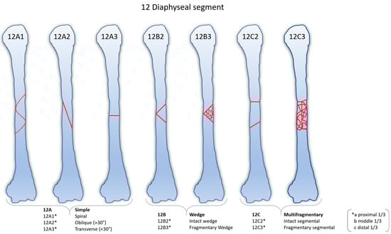 Classification of humeral shaft fractures (12 diaphyseal segments) according to the AO.