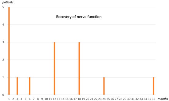 Complete recovery of nerve function was seen in 12 cases within 1 to 36 months. Two patients were lost in follow-up, and three patients still showed mild hypesthesia in the thumb area after 18 months. The patient data are shown in Table 1. Figure 3 shows the recovery of nerve function in the 15 patients over time.