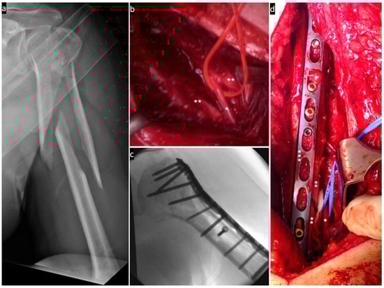 (a) Preoperative X-ray of the proximal fracture; (b) the nerve (one asterisk) is interposed between the bone fragments (two asterisks); (c) intraoperative X-ray control; and (d) the nerve (one asterisk) is now neurolysed and separated from the fracture (two asterisks) stabilised with a locking plate (three asterisks) by an absorbable mesh.