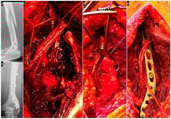 (a) Preoperative X-ray of the fracture; (b) postoperative X-ray control; (c) posterior approach. The interposed nerve (one asterisk) is lifted out of the multi-fragment fracture (two asterisks). (d) The nerve (one asterisk) lies relaxed on the repositioned fracture (two asterisks), which is temporarily secured with a clamp, a wire and two resorbable suture cerclages. (e) The nerve (one asterisk) crosses the locking plate (three asterisks) without tension.