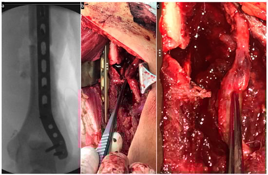 (a) Intraoperative X-ray control of the locking plate osteosynthesis. (b) The nerve (one asterisk) is clearly constricted by a periosteal cord (two asterisks) in the fracture area with plate osteosynthesis in place (three asterisks). (c) The connective tissue cord (two asterisks) in the fracture area next to the plate osteosynthesis (three asterisks) was severed. The neurolysed nerve (one asterisk) is intact in its continuity, but injured by the constriction.
