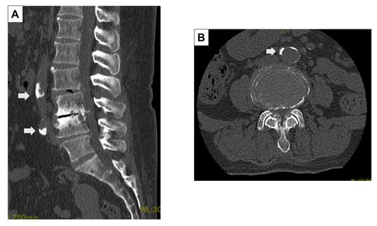All patients underwent preoperative and intraoperative CT. The preoperative CT (Discovery CT750 HD, Revolution CT, GE Healthcare, Waukesha, WI, USA, WL: 300, WW: 1200) was performed with the patient in the supine position. The intraoperative CT (O-arm®, Medtronic Sofamor Daneck, Memphis, TN, USA) was performed with the patient in the prone position when spine surgeons inserted pedicle screws into the vertebral bodies. The preoperative and intraoperative CT images were analyzed with multi-planer reconstruction (MPR) Works software (GE Healthcare, Waukesha, WI, USA) to measure each level precisely. In the CT axial image, at the L4 pedicle, L4/5 disc, L5 pedicle, and L5/S1 disc level, we measured the shortest distance between the abdominal arteries (aorta or common iliac artery, internal iliac artery) and the vertebral body or intervertebral disc (SDA: shortest distance to the aorta) on a line connecting the center of the abdominal arteries and the vertebral body or intervertebral disc (Figure 1) [12]. The amount of abdominal arterial translation (AAT) during surgery was defined as “SDA on intraoperative CT” minus “SDA on preoperative CT”. In addition, the presence of aortic calcification, and the bifurcation level to the common iliac artery were evaluated in the preoperative CT axial images (Figure 2).