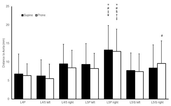 The shortest distance between the abdominal arteries and the vertebral body or intervertebral disc (SDA) at each level. Mean and standard deviations of the distances of the supine and prone positions are shown. The distances among seven points were compared by analysis of variance and the Tukey test. A p-value below 0.05 was considered significant in comparison with L4P (*), L4/5 left (#), L4/5 right ($), L5P left (†), L5/S left (‡), and L5/S right (¥).