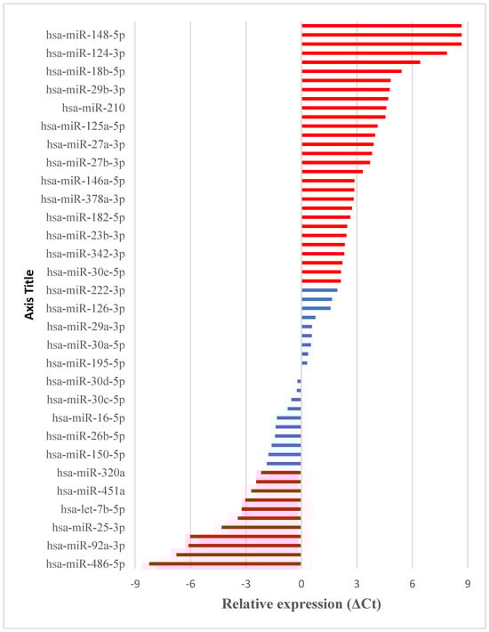 Among 84 miRNA associated with cardiovascular disease, 60 were detected (ΔCt method) in the tested, representative sample (Patient P-8), as shown at Figure 1. Among the 60 miRNA analyzed, the relative expression of 22 increased compared to the reference genes, and this increase was significantly higher for 11 of the tested miRNA (ΔCt < −2). The remaining 38 detected miRNA had lower expression compared to the reference genes, and among them 29 were significantly lower (ΔCt > 2).