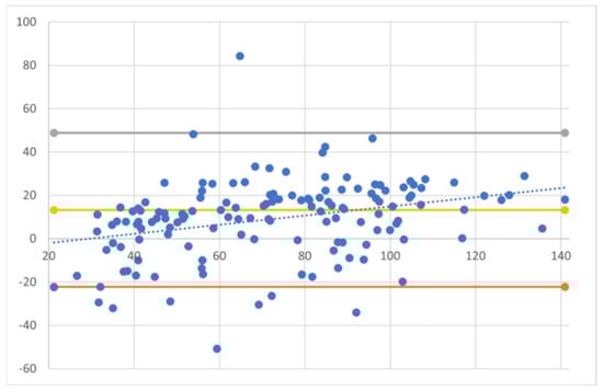 Bland–Altman plots showing the agreement between laser-planned central ablation depth and OCP-obtained central ablation depth for each operated eye. Dotted trendline expressing minimal proportion bias.