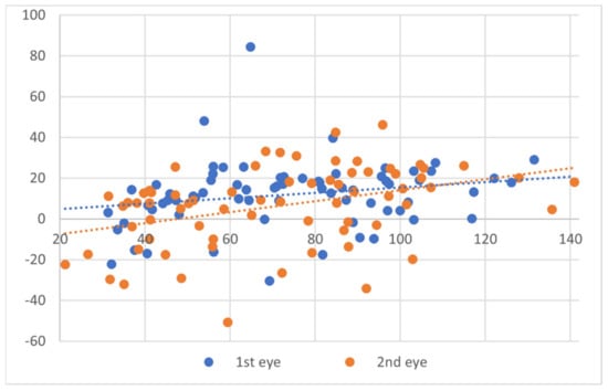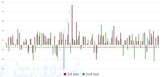 When comparing the Bland–Altman plots for each operated eye, significant differences between the two measurement methods were observed for each eye individually (first operated eye, p < 0.0001; second operated eye, p < 0.001) (Figure 2). In addition, DP was significantly higher for the first operated eye as compared to the second operated eye (11.97 ± 16.3 µm and 6.38 ± 19.3 µm respectively, p = 0.04). Figure 3 demonstrates the DP in the first- and second-operated eye of each patient, showing a higher DP in the first eye for the majority of patients (56%).