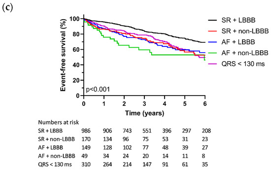 The baseline demographics and clinical characteristics arranged according to the rhythm and QRS morphology are shown in Table 4. Sinus rhythm in combination with an LBBB conduction pattern was significantly more prevalent in women compared to men, whereas the prevalence of sinus rhythm with different conduction patterns or atrial fibrillation with LBBB, non-LBBB, or a QRS below 130 ms, displayed a more balanced distribution between the sexes. Other differences are described in Supplementary Table S4, but they lack meaningful correlations.