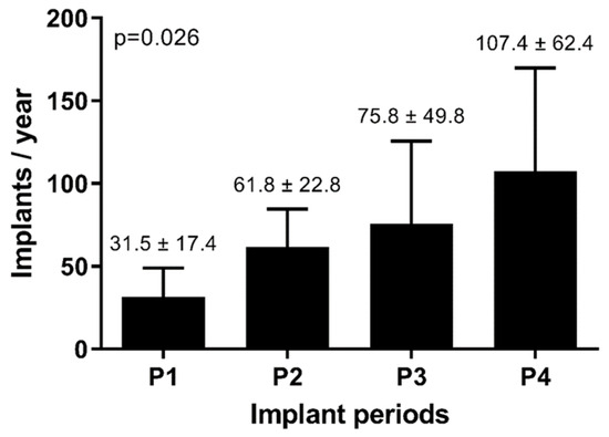 Progression of the mean annual implant rate across the four distinct periods is demonstrated in Figure 2. Notably, there was a significant and consistent upward trajectory in the number of annual CRT implantations (p = 0.026). Table 1 provides an overview of the evolution of the patient characteristics throughout the four periods, with group-to-group comparisons available in Supplementary Table S2. Over the course of the last two decades, patients who underwent CRT implantation have shown a trend toward older ages. The implantation of combined CRT–ICD devices (CRT-D) was higher in the first period compared to subsequent periods. Likewise, the implantation rates have shifted to lower NYHA functional classes in the latter three periods compared to the initial period. In addition, there has been a trend toward decreased implantation of epicardial leads over time.