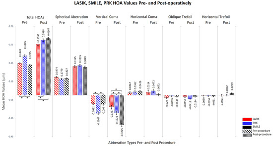 Comparison of vertical coma (Z3, −1) pre- and post-operatively. This figure showcases the changes in vertical coma for each procedure, with pre-operative values in diagonal stripes and post-operative in solid colors. Red denotes LASIK, blue PRK, and black SMILE. Error bars denote standard error, and asterisks (*) highlight statistically significant differences (p < 0.05). PRK = photorefractive keratectomy, LASIK = laser-assisted in situ keratomileusis, SMILE = small incision lenticule extraction, HOAs = higher-order aberrations.
