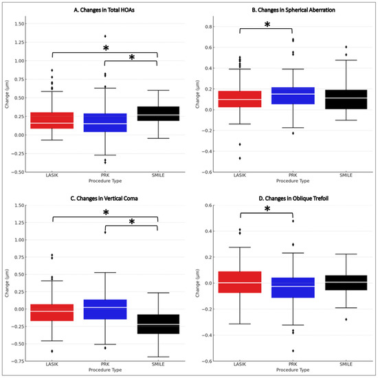 There were statistically significant differences in the median changes in total HOAs, spherical aberration, and vertical coma across all procedures (p < 0.05). Significant differences in total HOAs and vertical coma changes were identified post-SMILE compared to both LASIK and PRK (p < 0.05). Additionally, significant changes in spherical aberration and oblique trefoil were noted between LASIK and PRK (p < 0.05).