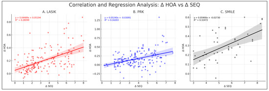 Analysis indicated non-normal distribution for Δ SEQ and Δ total HOAs in LASIK and PRK, with p-values of <0.05 for LASIK and PRK. In contrast, for SMILE, Δ SEQ and Δ total HOAs showed normal distribution, with p-values of 0.11 and 0.67, respectively. In the LASIK cohort, Δ total HOAs showed a Spearman’s correlation of 0.529 with Δ SEQ (p = <0.05, 95% CI: 0.033 to 0.056). For PRK, the correlation between Δ total HOAs and Δ SEQ was 0.373 (p < 0.05, 95% CI: 0.034 to 0.070). Similarly in the SMILE cohort, Δ total HOAs exhibited a Pearson’s correlation of 0.570 with Δ SEQ (p < 0.05, 95% CI: 0.033 to 0.085) (Figure 3).