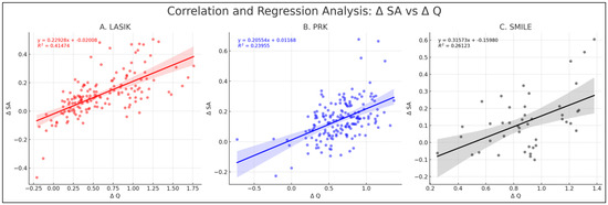 Across the three procedures, significant positive correlations were consistently observed between changes in SA and Q-value. Δ SA versus Δ Q in LASIK displayed the strongest Spearman’s correlation of 0.686 (p < 0.05, 95% CI: 0.592 to 0.762). In PRK, a moderate positive Spearman’s correlation of 0.4503 (p < 0.05, 95% CI: 0.323 to 0.562) was noted, while SMILE showed a relatively weaker yet significant correlation of 0.386 (p < 0.05, 95% CI: 0.101 to 0.613). A comparison between the correlations of LASIK and PRK indicated a significant difference in correlation strengths between Δ SA and Δ Q when comparing LASIK to both PRK (z = 3.17, p < 0.05) and SMILE (z = 2.46, p < 0.05). However, no significant difference was observed between PRK and SMILE (z = 0.446, p = 0.66) (Figure 4).
