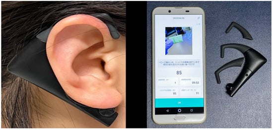Masticatory rhythm was measured using chewing gum [22] (Xylitol®, 1.5 g; Lotte Co., Ltd., Tokyo, Japan) and a wearable masticatory movement tracking device (BH-BS1RR Bitescan®; Sharp Corp., Osaka, Japan). This device has an infrared distance sensor and accelerometer and scans the morphological change in the skin surface on the posterior side of the pinna at a mastication frequency of 20 Hz (Figure 1). The device is designed to be worn on the right side and has a variable ear-hook. A small, medium, or large ear-hook was chosen according to the size of the patient’s pinna. Before measurements were obtained, the Bitescan device was fitted on the participant’s ear to ensure that the sensor was correctly located on the back of the pinna. The Bitescan device was connected to a smartphone (SHM05, Sharp Corp.) via Bluetooth, and the data were collected using a smartphone application [28].