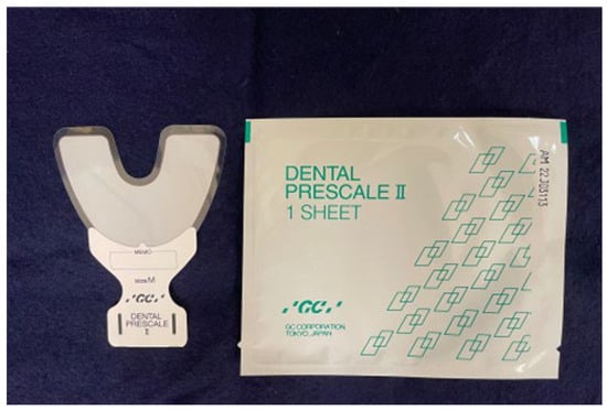 Maximum occlusal force (MOF) was measured on both sides using a dental prescale system that included a pressure-sensitive film (Dental Prescale 50H Type R; GC Corp., Tokyo, Japan) and an analyzer (Occluzer FDP705; GC Corp) (Figure 2). Participants held the pressure-sensitive film lightly between the maxillary and mandibular dental arches while sitting. On receiving the signal from the examiner, the participant performed maximum jaw clenching for 3 s in maximum intercuspation. Participants who used dentures were examined while wearing them. MOF in Newtons [N] of the full dental arch was calculated by scanning the pressure film using a pre-calibrated analyzer [33].