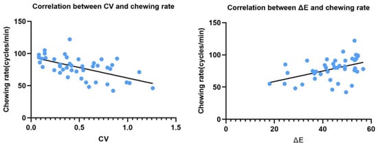 Correlation between CV, food mixing ability, and chewing rate (n = 44). The R2 value for the CV regression line was 0.329 and that for ΔE was 0.206. ΔE, food mixing ability; CV, coefficient of variation from cycle duration.