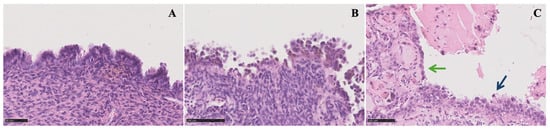 Microscopic view of different grades of endometrioma atypia (50–100 μm): (A) typical endometrioma is lined by endometrioid epithelium with no endometrial stroma beneath it; (B) endometrioma with atypia showing nuclear pleomorphism, an inverted nucleus-to-cytoplasmatic ratio, and abundant eosinophilic cytoplasm with epithelial stratification and tufting; (C) endometrioma with foci of atypia (green arrow) and foci of clear cell carcinoma (blue arrow).