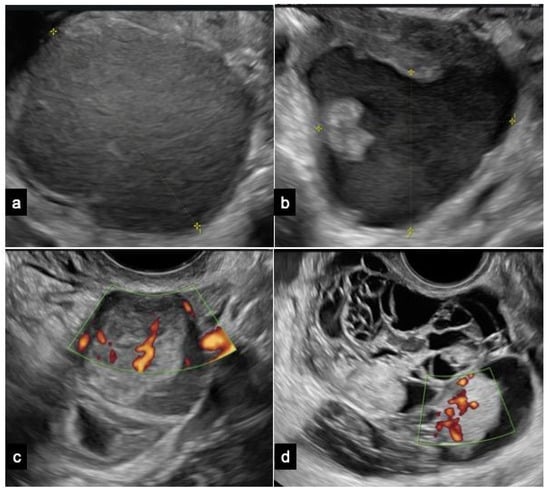 Ultrasound images of (a) a typical endometrioma, (b) an atypical endometrioma, (c) a clear cell carcinoma, and (d) an endometrioid carcinoma. The ultrasonographic diagnosis was confirmed by pathological examination, and patients provided informed consent for the use of their images.