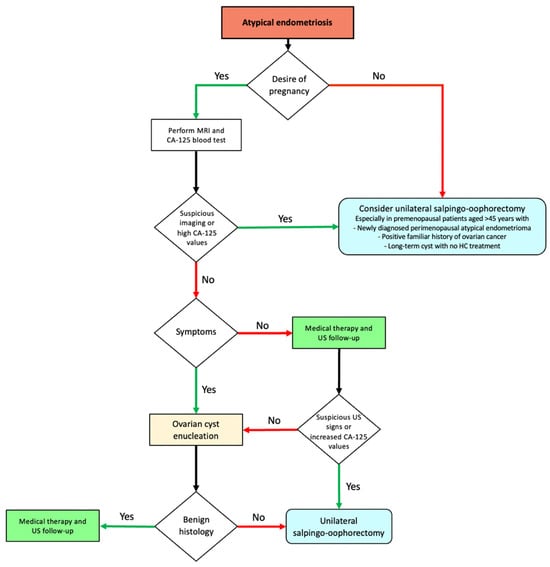 Flowchart for surgical management of ovarian atypical endometriosis. Abbreviations: MRI, magnetic resonance imaging; HC, hormonal contraceptive; US, ultrasound.