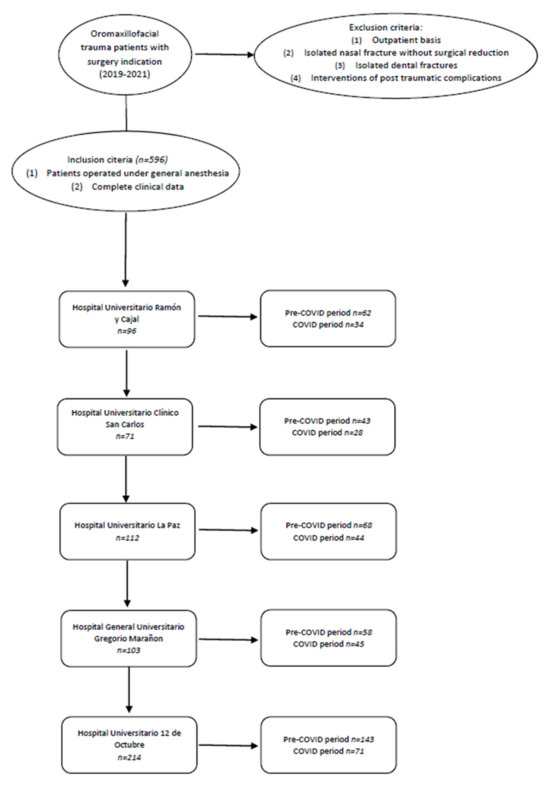 This study comprised a retrospective multicenter comparative cohort investigation of patients undergoing surgery for oromaxillofacial fractures at oromaxillofacial surgery departments in Madrid (Spain) during both the pre-COVID-19 and COVID-19 periods. The incidence and patient characteristics during the initial year of the coronavirus pandemic were compared with those of a control group from the corresponding period in the previous year. The COVID-19 period was defined as 1 year after the start of strict confinement in Spain in March 2020, with equivalent data collected from patients who underwent surgery in the same period the preceding year, from March 2019 to February 2020 (pre-COVID-19 group). This one-year limit was chosen due to the occurrence of severe government restrictions and subsequent COVID-19 waves during this period, significantly impacting the social life of the Spanish population. Accordingly, two groups were established: (1) pandemic group (PG) or experimental group: between 1 March 2020 and 28 February 2021; and (2) pre-pandemic group (PPG) or control group: between 1 March 2019 and 28 February 2020.
