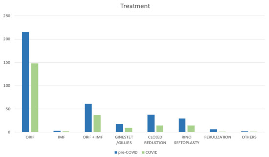 Surgical treatment during pre-COVID-19 year and COVID-19 year. Abbreviations: ORIF, open reduction, internal fixation; IMF, intermaxillary fixation.