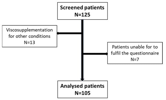 After inclusion, 105 patients completed the questionnaire. The flowchart is presented in Figure 1. The general characteristics of patients are shown in Table 1. The mean age was 66.1 ± 13.2 years, and the mean BMI was 27.5 ± 7.5 kg/m2. Our population included a larger proportion of women (62%) and retired people (57%).