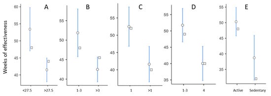 Duration of the viscosupplementation effectiveness according to (A) body mass index (kg/m2); (B) number of previous viscosupplementations; (C) number of involved knee compartments; (D) Kellgren–Lawrence grade; (E) lifestyle (◦ = mean; □ = median).