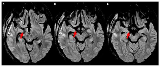 Axial FLAIR MRI acquired at 4 weeks after ischemic stroke in the right middle cerebral artery territory because of endocarditis involving the posterior limb of the internal capsule within the territory of the left anterior choroidal artery. Panels (A–C) show sequential slices from top to bottom at the level of the cerebral peduncle. The hyperintense signal (red arrows) corresponding to the course of the corticospinal tract is clearly evident on the right side in comparison with the normal signal on the left side.
