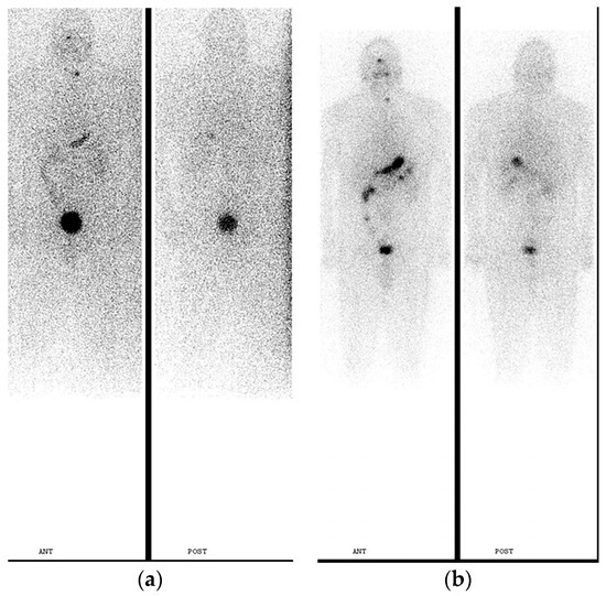 - Souza Rosario, P.W.; Barroso, A.L.; Rezende, L.L.; Padrao, E.L.; Fagundes, T.A.; Penna, G.C.; Purisch, S. Post I-131 therapy scanning in patients with thyroid carcinoma metastases: An unnecessary cost or a relevant contribution? Clin. Nucl. Med. 2004, 29, 795–798. [Google Scholar] [CrossRef]