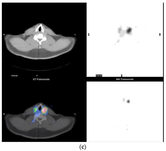 Post-treatment scanning with SPECT/CT can detect significantly more neoplastic lesions than planar PT-WB imaging. SPECT/CT scans altered patients’ classification and changed the treatment management in 16% or 25% of cases [55,56], while the therapeutic approach was changed in 41% of patients [57]. Aide et al. reported a difference between post-therapeutic I-131 scans, with 29% indeterminate findings on planar and only 7% on SPECT/CT images, leading to patients’ restaging and expected outcomes during the follow-up [58]. Ciappuccini et al. showed that SPECT/CT imaging integrated with planar WBI has 78% sensitivity and 100% specificity in predicting recurrent or persistent disease [59].