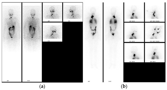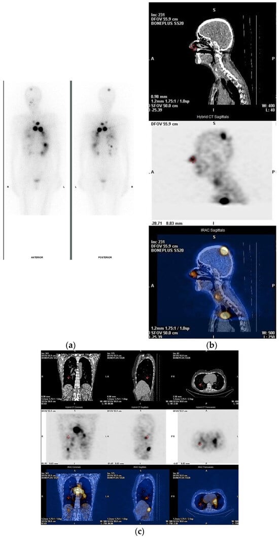 Post-ablation imaging shows higher sensitivity in comparison to pre-ablation scanning. PT-WBI may disclose the presence of unsuspected metastatic lesions in 10–26% of high-risk patients [48,49], and much less in low- and intermediate-risk DTC patients (in ~2% of cases), leading to re-classification of DTC staging [50]. PT-WBS images that show new metastatic foci, which were not seen on dxWBI, are shown in Figure 3 and Figure 4.