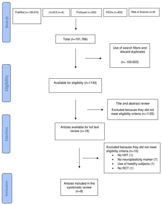 In total, 101,766 articles were retrieved from the searches, after applying filters and eliminating the repeated articles. A total of 1143 results were obtained. Once the initial evaluation was completed, a total amount of 174 studies remained. Once the full-text review was completed, 10 studies were discarded because they did not meet the inclusion criteria. In the end, a total of eight studies were included in the review. The exclusion of studies was made for different reasons: no neuroplasticity markers studied (7), review article (1), use of healthy subjects (1) and no HIIT intervention used (1). See Figure 1.