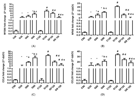 Myocardial mRNA expression of (A) MYD88, (B) NF-kB, (C) CCL4, (D) CCL20, and (E) CCR2. * C90 vs. G30 or G60 or G90 (p < 0.001); a G30 vs. G60; b G30 vs. G90; c G60 vs. G90; # C120 vs. G120 or GF120 or GR120 (p < 0.001); d G120 vs. GF120 or GR120; e GF120 vs. GR120.