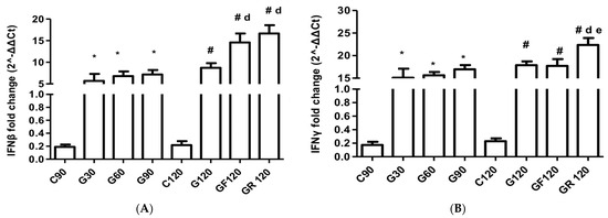 Myocardial mRNA expression of (A) IFNβ and (B) IFNγ. * C90 vs. G30 or G60 or G90 (p < 0.001); a G30 vs. G60; b G30 vs. G90; c G60 vs. G90; # C120 vs. G120 or GF120 or GR120 (p < 0.001); d G120 vs. GF120 or GR120; e GF120 vs. GR120.