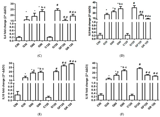 Myocardial mRNA expression of (A) IL-1b, (B) IL-2, (C) IL-4, (D) IL-8, (E) IL-10, and (F) IL-18. * C90 vs. G30 or G60 or G90 (p < 0.001); a G30 vs. G60; b G30 vs. G90; c G60 vs. G90; # C120 vs. G120 or GF120 or GR120 (p < 0.001); d G120 vs. GF120 or GR120; e GF120 vs. GR120.