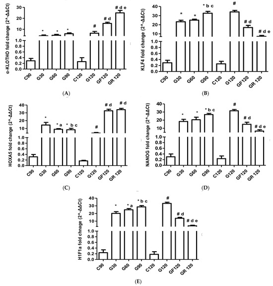 Myocardial mRNA expression of (A) klotho, (B) KLF4, (C) HOXA5, (D) NANOG, and (E) HIF1α. * C90 vs. G30 or G60 or G90 (p < 0.001); a G30 vs. G60; b G30 vs. G90; c G60 vs. G90; # C120 vs. G120 or GF120 or GR120 (p < 0.001); d G120 vs. GF120 or GR120; e GF120 vs. GR120.