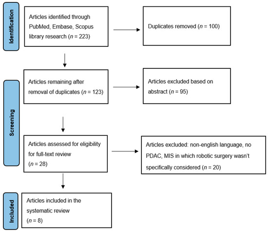 Randomized controlled trials, meta-analyses, systematic reviews, case-matched studies, and retrospective cohort studies were all eligible for inclusion if they were focusing on patients with pancreatic ductal adenocarcinoma (PDAC). The selected articles were required to analyze robotic pancreatic surgery with vascular resections versus other techniques of pancreatic surgery. We excluded all non-English language and no full-text available articles. We also excluded articles about minimally invasive surgery (MIS) in which robotic surgery was not specifically considered.