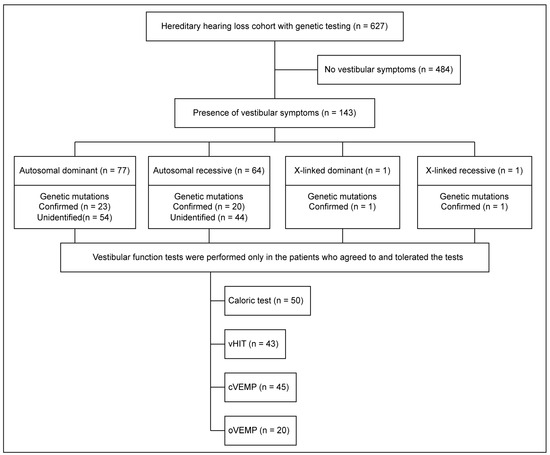 Flow chart for patient selection, the number of patients with confirmed genetic mutations, and the number of patients who underwent each vestibular function test. cVEMP, cervical vestibular-evoked myogenic potential; oVEMP, ocular vestibular-evoked myogenic potential; vHIT, video head impulse test.